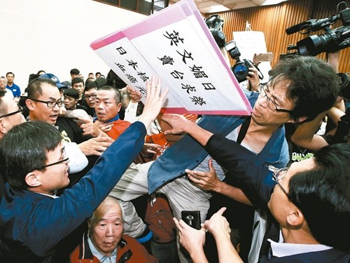 据台湾《联合报》报道,台当局“农委会”12日在云林、嘉义、台南、高雄连赶4场公听会。首场台南场上,国民党台南市议员卢昆福、蔡育辉质疑主办单位做法偷渡,弄翻茶水、资料,与“农委会国际合作处处长”陈俊言爆发口角,陈还被推挤至座位上。会议被迫中断。