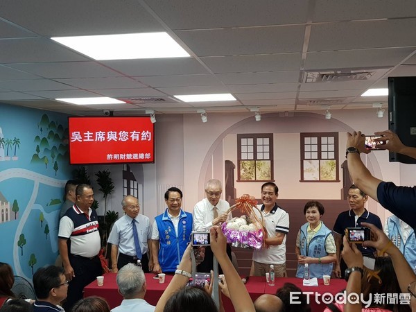 吴敦义到国民党提名的新竹市长参选人许明财竞选总部辅选。(图片来源:台湾“东森新闻云”)