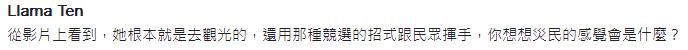 国民党发言人洪孟楷在Facebook痛批这是“史上最傲慢勘灾”,形容蔡英文像是“花车游行上的选美小姐”。还有民众火大开呛,“勘灾?连下来泡在水里做做秀都不肯,搭云豹来就算了,装一下沉痛、装一下反省可以不可以?面带微笑是哪招?还给我挥手!你是来谢票还是来扫街?你确定你没有跑错棚?”