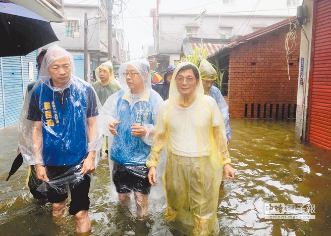 韩国瑜(左)到永安区永华路探视淹水灾情。(图片来源:台湾“中时电子报”)