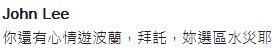 邱议莹Facebook粉丝页也被网友灌爆留言,“可以出来用骂薛香川的力道来检视一下陈建仁吗?”“怎没见你气到踹门、砸电视还是快中风啊?”“还有心情去金门旅游,拜托,水灾欸”“拜托,人家台湾价值欸”“那些灾民只是录像带啦(邱曾指场外劳工抗议是放录像带)”,不少网友狂用“拜托水灾欸”五字洗版。