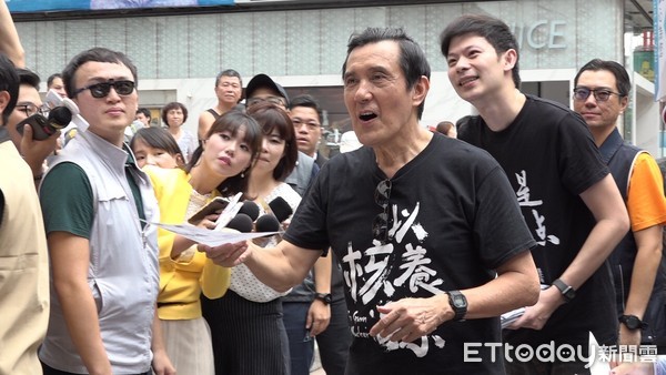 马英九穿上“我是人,我返核”黑衣上街头发联署书。(图片来源:台湾“东森新闻云”)