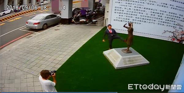 日本人藤井实彦用脚踹慰安妇铜像的粗暴行为被监视器全都录下。(图片来源:台湾“东森新闻云”)