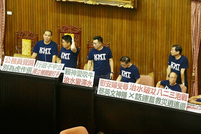 国民党“立委”在现场摆满抗议标语,包含“公务员觉醒、别为虎作伥”“慰安妇受辱、蔡英文神隐”“赖神爱吹牛、治水变滞水”“行政不中立、独立机关变打手”“赖清德绑桩、政策买票7400亿”“假新闻真独裁、箝制新闻自由”;还在地面铺上“东厂乱政、民主之耻”“促转恶转、赖揆道歉”大字。随后一行人边开会边占领主席台。
