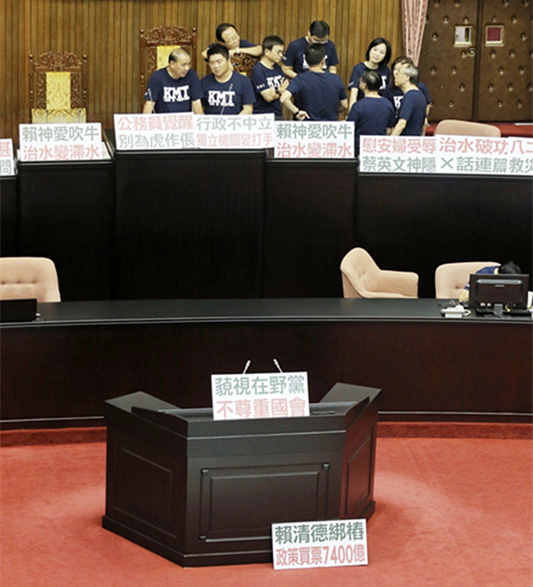 台湾“立法院”今天开议,国民党“立委”们一早就占据主席台,排列出各式标语批评“行政院”。(图片来源:台湾《联合报》)