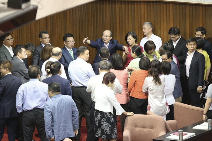 据报道,国民党团书记长曾铭宗一早6时就先到场坐在主台上准备,其余“蓝委”接近8时陆续进场在主席台上开会,展开占领行动。