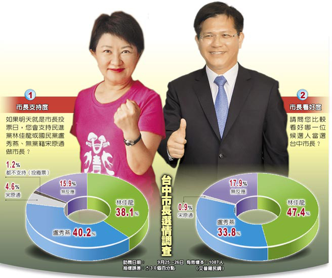 民调显示,在选民看好度部分,仍有47.4%的台中市民认为拥有行政资源的林佳龙会当选,卢秀燕的看好度只有33.8%。但以支持度而言,卢秀燕以40.2%微幅领先林佳龙38.1%,但2人的支持度在3%误差范围内,代表胜负仍在拉锯中,不表态者尚有15.9%,在11月24日投票日将成为关键力量。