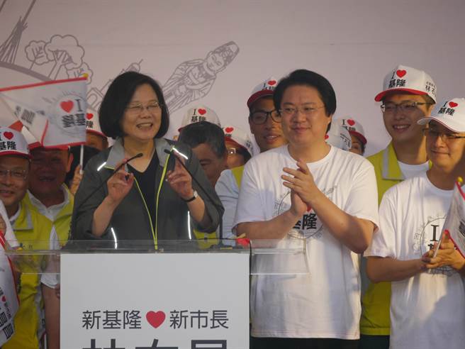 蔡英文(左)今日上午出席基隆市长林右昌竞选总部成立大会,为林右昌(右)站台。(图片来源:台湾“中时电子报”)