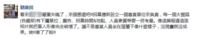 不少看到此图的网友也有感而发,有人说“这比算命摆摊还可怜”,有人叹“今天的招募员就是明天的你”,有人道“没了退休金的保障,募兵制注定失败”,有人骂“执政党把军人贬低成这样,没了尊严,自然招不到人”,有人盼“国民党快起来挽救军人的地位、尊严和福利”……当然,也有善良的网友向台防务部门谏言:招募应由专责单位负责,如此打游击式的摆摊召募,既无成效也伤台军形象。