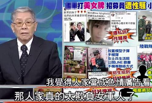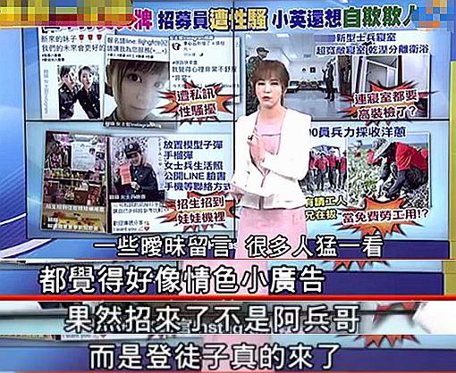 除此之外,就连招个1年期志愿役军官都得靠将女士官军装照与Facebook、line联络方式放进夹娃娃机里的做法也让台湾政论节目主持人和嘉宾痛批:如此化浓妆、穿短裙,并带有“性暗示”的招募广告,不仅是一种“诈骗”更是物化女性的表现,“真的太欺负女军人了”。