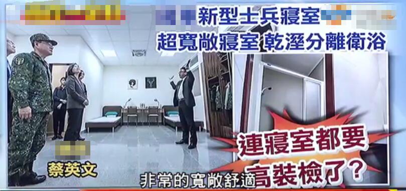 据悉,蔡英文曾到台湾军营中参观所谓的新型士兵寝室,从画面中可以看到,为官兵准备的新寝室超级宽敞舒适不说,连卫浴间都是干湿分离的!
