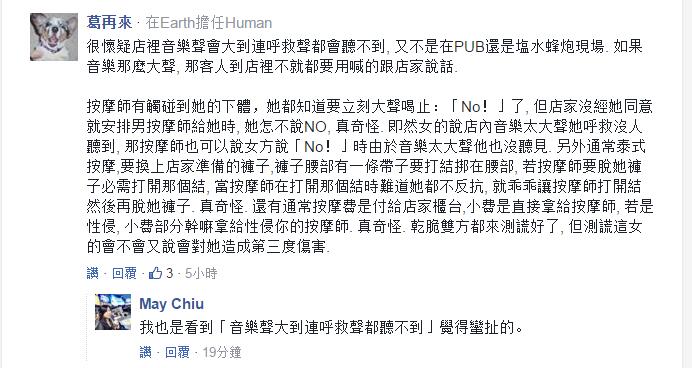 而面对自家员工的丑闻,按摩店的老板娘则表示,她虽然不清楚事情的来龙去脉,但该名员工已到职2年,平常没有异状、口碑也很好,若性侵属实将开除该名员工,若两人属于合意性交,也违反店内规定,将暂停他的工作。此外,老板娘也强调,但假设是不实指控或合意性交,她将会反告台女,因为对方的行为已经导致她的店名誉受损。