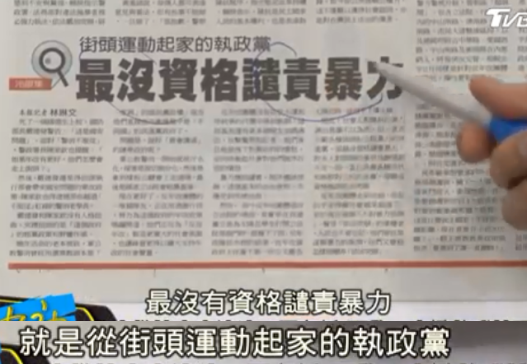 台湾媒体评论也表示,对于暴力全世界都可以批评,就是民进党没这个资格,因为你就是靠这玩意上台的。