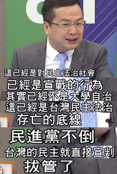 “欲加之罪,何患无辞”,蔡当局粗暴“卡管”的背后,正是民进党对台湾所谓民主法治的宣战,也许,前马英九办公室副秘书长罗智强所言非虚:民进党不倒,台湾的民主也就可以宣判“拔管”了!