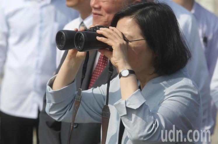 蔡英文到苗栗县用望远镜眺望,视察离岸风力发电机。(图片来源:台湾《联合报》)