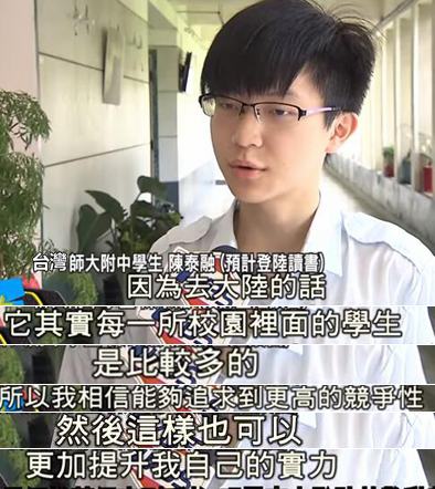 “除了一流大学外,不少学生还一口气申请了5、6所大陆大学”,桃园市复旦高中校长段台民说,就算是大陆2、3线的大学,学生也都会申请,根本就是“吃了秤铊铁了心”的要到大陆念书;武陵校长林清波也以校内一名程度“优秀”的学生为例,指就算已获保送台大资格,但这名学生仍决定考学测以申请北京大学元培学院,而该学生的哥哥去年就已到北京清华大学念书了。