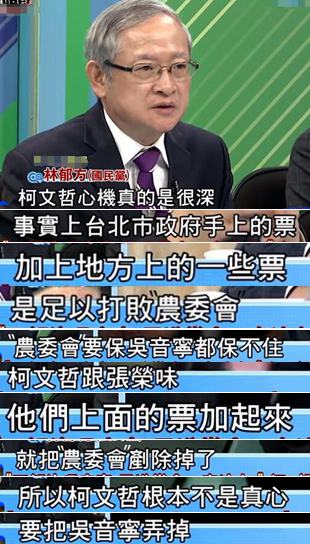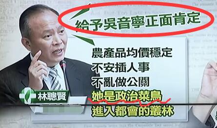 “主委”林聪贤力挺吴音宁,不仅夸赞说她上任以来农产品的平均价格都很稳定,还称她是“进入都市丛林的政治菜鸟”;