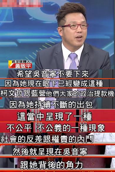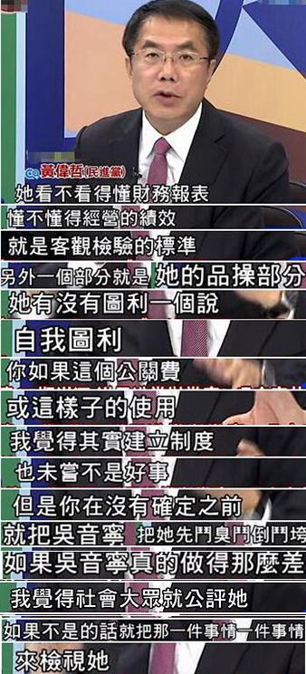 民进党民代黄伟哲也在政论节目中舌战“怼吴团”,不仅说吴音宁品操没问题,从没做过“自我图利”的事儿,还指责外界明明没有把所谓“公关费”的制度建好,却还硬要先把吴音宁“斗臭斗倒斗垮”。