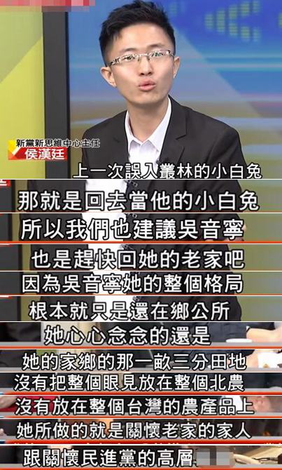 新党新思维中心主任侯汉廷就说,既然是“误入”那就哪儿来回哪儿去吧,反正吴音宁也没有把心思放在北农和台湾的农产品上;