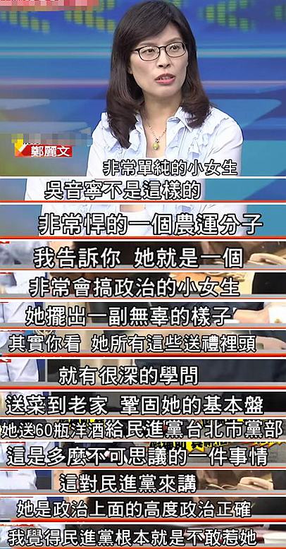 “行政院”前发言人郑丽文则直言,吴音宁分明就“非常会搞政治”,并且因为她在民进党高层眼中是“政治上高度正确”,所以民进党团里根本没人敢惹她!