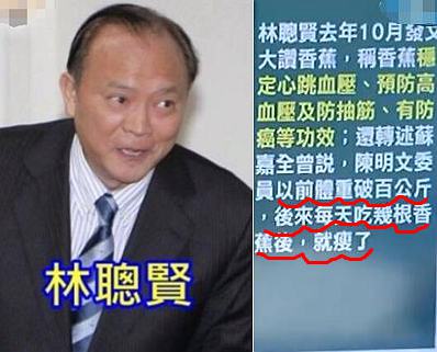 这两位近来因为岛内香蕉过剩滞销的问题被整得一个头两个大,其中“主委”林聪贤为了帮忙推销,不仅说“香蕉是会快乐的食物”,还曾在脸谱网上公开宣称香蕉可以预防高血压,更夸张的是,林还举例称“每天吃香蕉可以减重”……网友对此质疑,这些“疗效”根本没有医学验证,官员公开这么宣传,算不算假新闻?