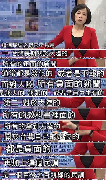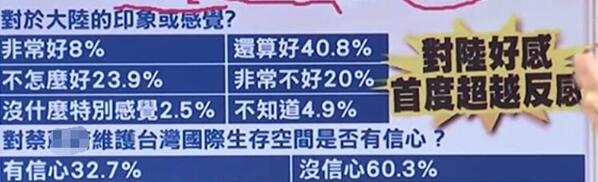 同一份亲绿媒体的数据显示,台湾民众对大陆的好感度“有史以来第一次”出现了正面评价,政论节目主持人黄智贤对此表示,这个100%亲绿民调能有这样的结果绝对是“来之不易”,黄暐瀚更激动地直言,这份好感度的排名也印证了那句话——还马英九公道者必蔡英文!