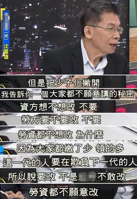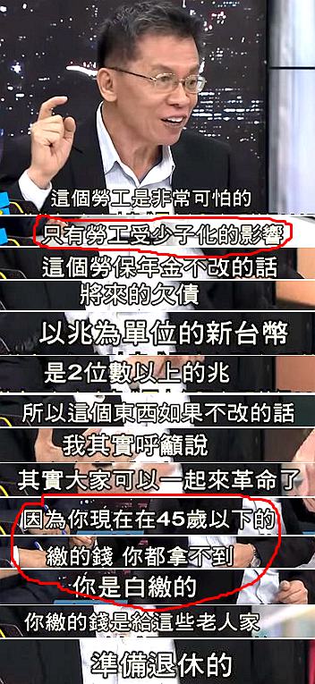 沈富雄指出,劳保年金受少子化影响,若照现行制度来看,将来的欠债是2位数以上的、以兆为单位的新台币。他还强调,现在台湾45岁以下劳工缴的钱,其实都是为退休老人家准备的,为此也建议55岁以上的劳工可以加减缴费,55岁以下不要交,“我带你们去革命”。