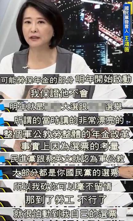 王鸿薇也直言不讳的表示,民进党和蔡英文认为大部分军公教都是国民党的选票,所以砍起年金来毫不留情,但劳工可是民进党自己的选票,自然不敢轻易动。