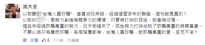 而在心疼之余,也有人认为,这些选民是“自作自受”,赖清德的台南市长,蔡英文的台湾地区领导人,不都是源自他们对“诈骗集团”至死不渝的爱么……