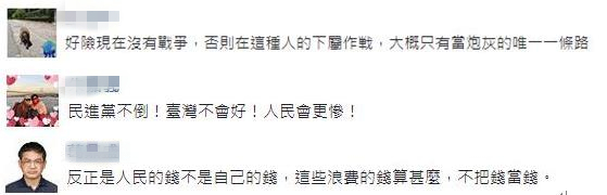 对此,台湾网友愤怒道:“好险现在没有战争,否则在这种人的下属作战,大概只有当炮灰唯一一条路”“民进党不倒!台湾不会好!人民会更惨”“反正是人民的钱不是自己的钱,这些浪费的钱算什么,不把钱当钱”。