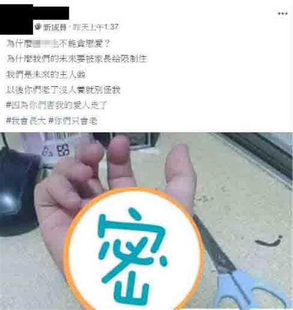 暑假才刚开始没几天,就有学生脱序事件频传。4日,有网友在脸谱网上发现,一名初中生PO出“割腕照”,内容是他疑似在父母的压力下,被逼和女友分手,并写下“为什么初中生不能谈恋爱?为什么我们的未来要被家长给限制住?我们是未来的主人翁,以后你们老了没人养就别怪我!”最后更呛出“我会长大,你们只会老。”