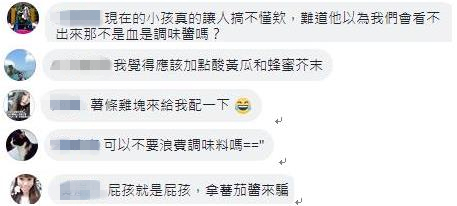 但照片中,明显可以看出手腕上的并不是鲜血,而是西红柿酱,让其他网友看了纷纷笑回,“现在的小孩真的让人搞不懂,难道他以为我们会看不出来那不是血是调味酱吗”“薯条鸡块来给我配一下”“屁孩就是屁孩,拿西红柿酱来骗”。