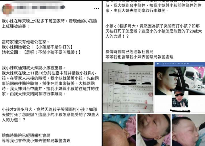 近日,台中一位网友在脸谱网爆料,三个多月大的外甥因为哭闹被亲生爸爸施暴,爸爸不知悔改还呛“不然小孩别叫我带”,目前男婴妈妈已将孩子带往医院验伤并通报社会局处理。