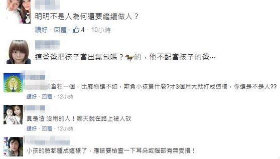 对此,台湾网友十分愤怒,“明明不是人为何还要继续做人?”“把孩子当出气包吗?不配当爸爸”“畜生一个,欺负小孩算什么”,还有好心网友提醒:“小孩的脸都肿成这样了,应该要检查一下耳朵或者脑部有无受损。”