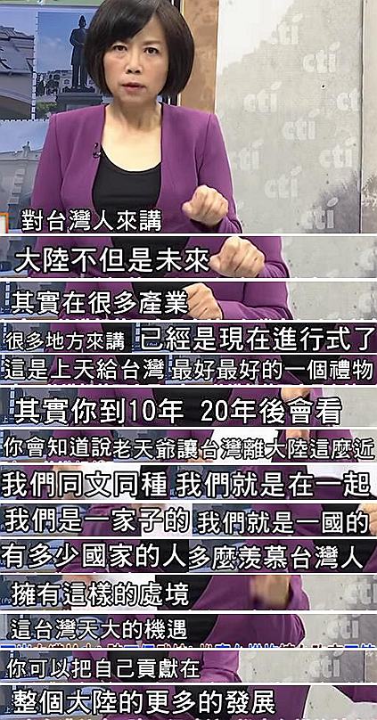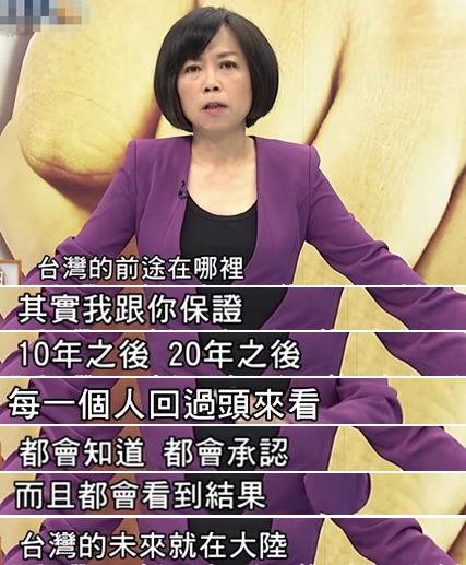 当现在越来越多的台湾人意识到他们的未来与出路在大陆时,台湾或许还有“救”。黄智贤对此就很喜闻乐见,她表示也许10年、20年后,台湾人回头看会发现,能把自己贡献在整个大陆的发展中,是上天给台湾最好最好的礼物;黄智贤更强调,两岸同文同种,“我们就是一国的,多少国家羡慕台湾人拥有这样的机遇”、“台湾的未来一定在大陆”!