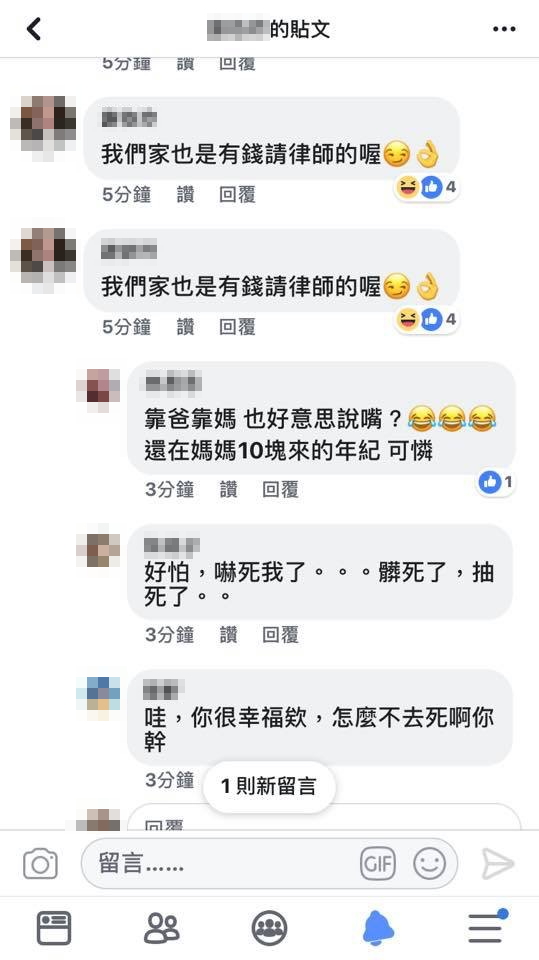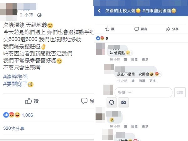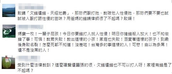 事后,其中一名霸凌女子在脸谱网贴文指出,欠钱还钱,天经地义,今天若是你们遇上,你们也会选择动手吧,欠6000还6000,我们也没跟她多收,我们不是钱庄喔,不要因为看到新闻就否定我们,我们平常是乖宝宝好吗,不要只会出张嘴。贴文引来众多网友围剿,可是女子却反呛“我们家也是有钱请律师的喔。”