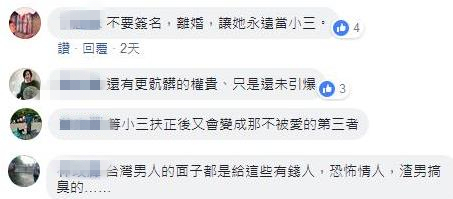 对此,台湾网友表示:“不要离婚,让她永远当小三”“等小三被扶正后又会变成那不被爱的第三者”“台湾男人的面子都是给这些有钱人、恐怖情人、渣男搞臭的”。