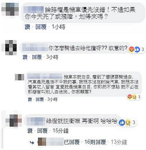 但万万没想到有部分网友看完后竟反酸吴男,“绿灯就狂冲嘛,再冲啊,哈哈哈”、“你怎么骑过去给他撞呀?故意的?”、“明知道车子想过,还硬要直行过,觉得自己路权大自己就对,活该”、“下次遇到砂石车也一样要用生命捍卫路权哦”。
