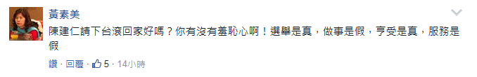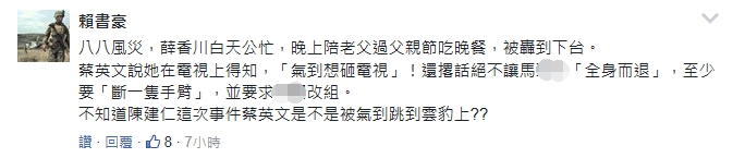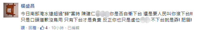 而以民进党一贯的作风,在出了事之后,也绝不会这么轻易认输投降。果不其然,就在昨天,陈建仁于脸谱网贴文致歉,还提到自己没有防灾职权,以求避免跟当年薛香川同样的下场。可惜的是,网友对此并不买账,甚至纷纷吐槽“这种行径很恶劣你知道吗?”“以前骂别人骂得很过瘾,现在是现世报!”