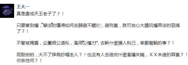 然而,这并不会有什么卵用,铺天盖地的骂声依旧滔滔不绝,有网友表示张天钦“真是变成天王老子了,滥用公权力去干损人利已、卑鄙龌龊之事”;