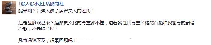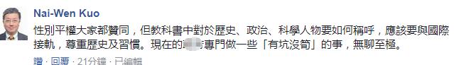 还有批评台“教育部”根本就是“唯我独尊的霸权心态”、“不尊重历史文化,却还奢谈‘性别尊重’?”;