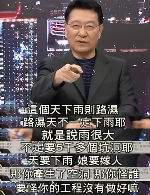 正所谓天要下雨,娘要嫁人,道路产生的问题,当然要归咎于工程没有做好,就像台湾资深媒体人赵少康所言,“下雨则路湿,但路湿却不一定下雨,雨大不大,跟坑洞的问题并没有必然的联系。”