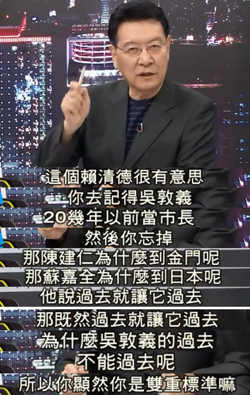 既然陈建仁、苏嘉全、邱议莹的过去能过去,那么为何吴敦义的过去不能过去呢?对此,赵少康给出了答案:双重标准。