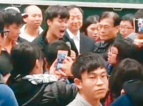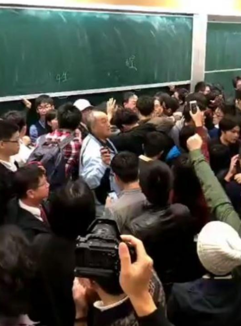 这些抗议者情绪激动,高呼“不要脸!”,将江宜桦围在中间,不许他说话,不许他在黑板上写字,不许他留在讲台,又不许他走!看一下当时的混乱画面: