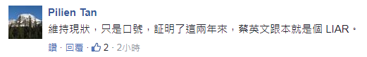 而针对蔡女士“宁折不弯”的做法,岛内网友也纷纷为其竖起大拇哥,“请继续‘维持现状’,2020就让你明白‘现状为何’!”;还有人表示,“听小英喊了两年口号,现在才知道,原来她就是个骗子!”看到这里,二仔不免要吐槽一句:兄弟,你有点儿后知后觉了……