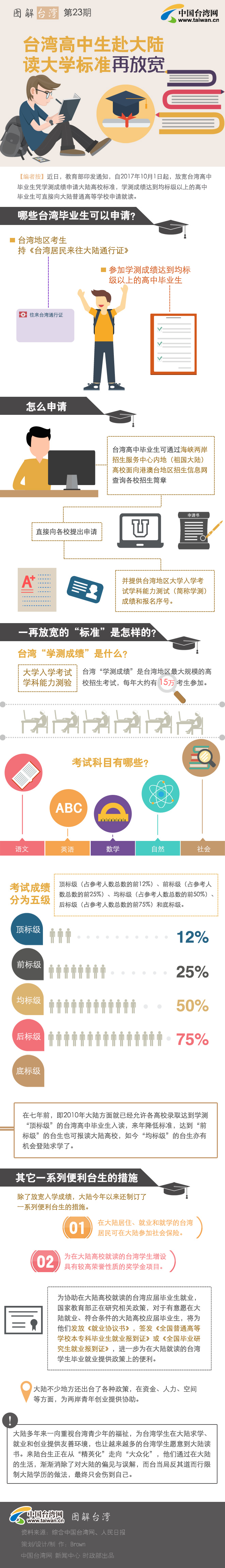 【编者按】近日,教育部印发通知,自2017年10月1日起,放宽台湾高中毕业生凭学测成绩申请大陆高校标准,学测成绩达到均标级以上的高中毕业生可直接向大陆普通高等学校申请就读。