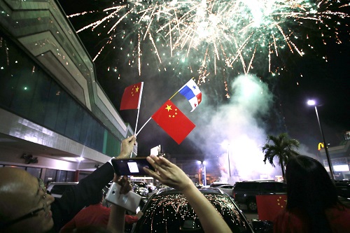 资料图:6月12日,在巴拿马首都巴拿马城的华人社区,人们在巴拿马与中国建交的庆祝活动上拍摄烟花。新华社发