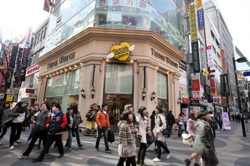资料图片:2011年3月2日,人群经过韩国首尔明洞购物区的一家服装店门口。新华社记者 何璐璐 摄