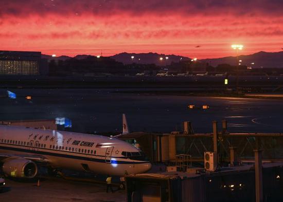 资料图片:2017年5月22日,北京首都机场航站楼外晚霞满天。新华社记者 李贺 摄