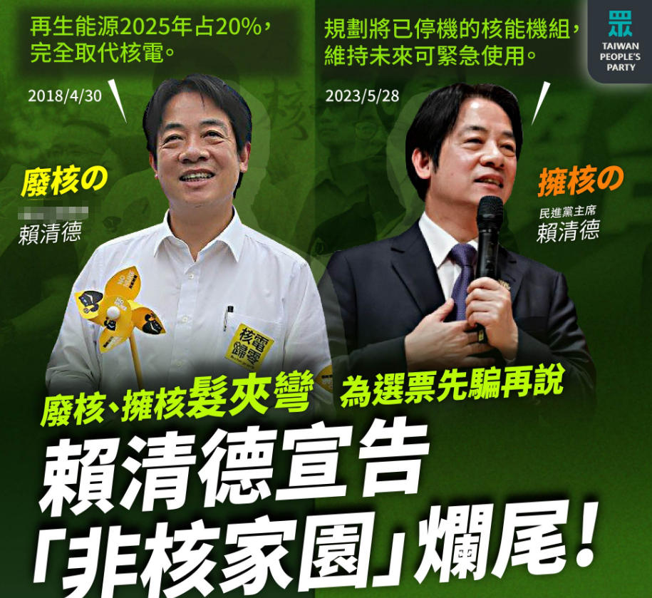 说到底,不管是如今的赖清德,还是从前的蔡英文,都没有从能源需求或经济因素或业界呼声等角度考虑过核电问题。民进党的反核操作完全是一本政治生意经。他们利用政客、名嘴、网军、侧翼夸张核电危害、鼓噪反核氛围,打出“我是人,我反核”等激进口号,让反核成为不可讨论的“政治正确”,成为民进党选举的“催票机”。在他们眼中,与选票比起来,经济账、民生账都可以忽略不计。